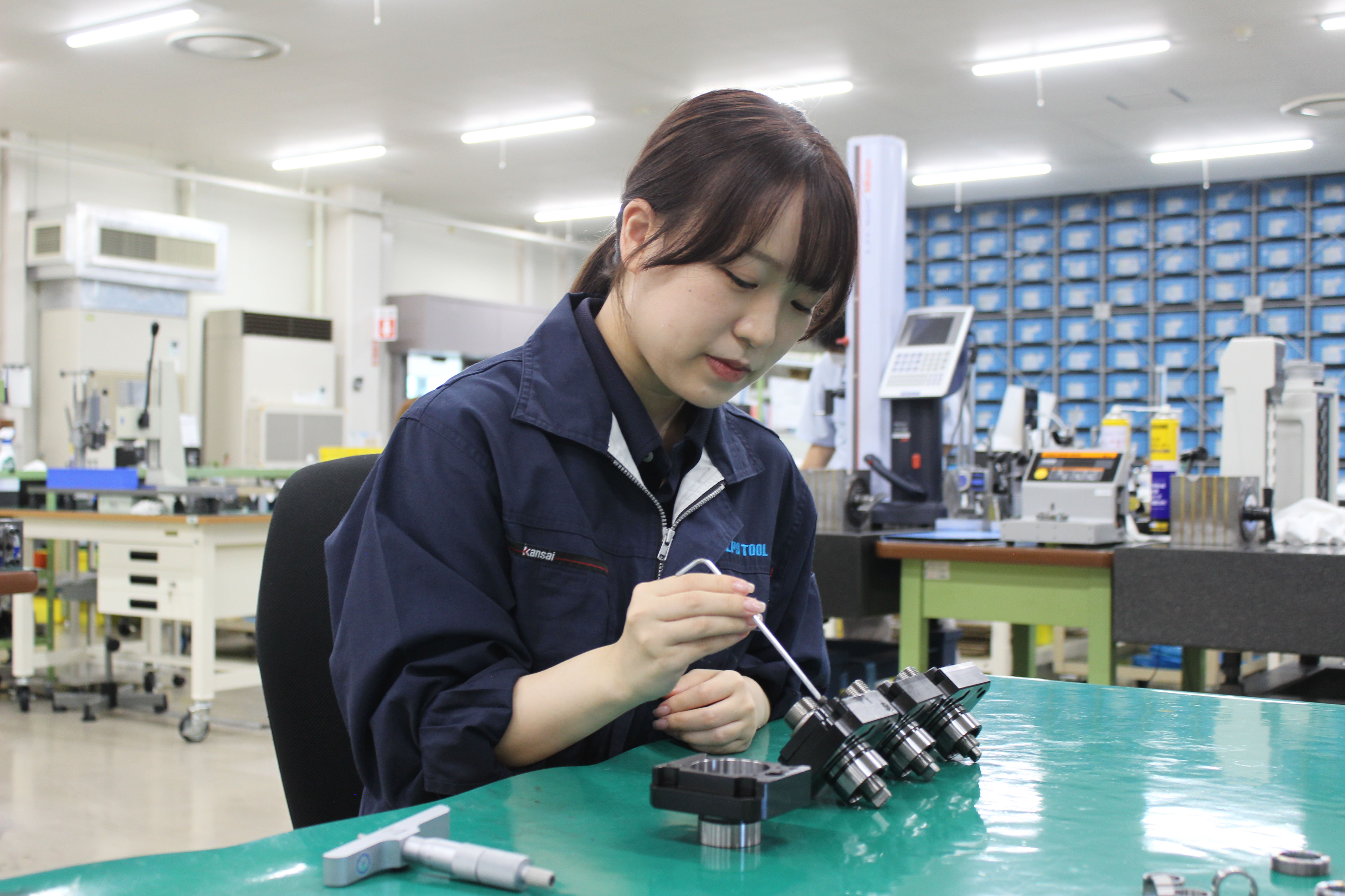 第一製造部の組立検査課に所属し、回転工具の組立作業をしています。部品を揃えて洗浄し、決められた順番通りに組み立てていくことが主な仕事です。組み立てた製品の回転試験を行うところまでを担当しています。確実さが求められる仕事なので、集中力を切らさずに1つひとつの作業に気を配るようにしています。